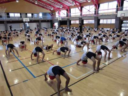 5・6年生は、体育館で運動会の表現(組体操)の練習をしました。今日は「一人技」を中心に、やり方やリズム、注意点の確認をしていました。