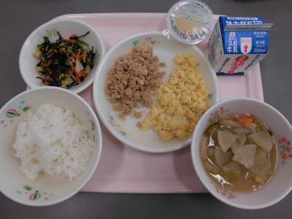 ○ご飯 ○牛乳 ○二食そぼろ丼 ○炒り卵 ○いそか和え ○さつま汁