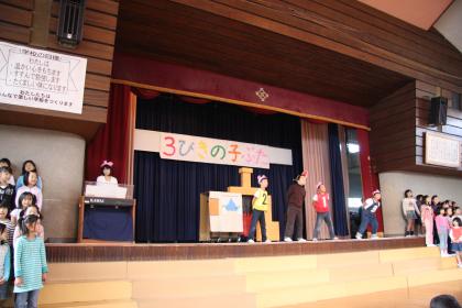 7組では「3びきの子ぶた」の劇をやりました。たくさんのボランティアの子どもたちに協力してもらい、大成功!!