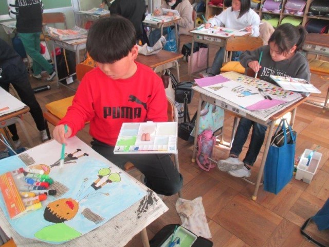 3年生は図工で、絵の仕上げをしました。ピアノの発表会やボードに乗っているところなどを絵に描きました。