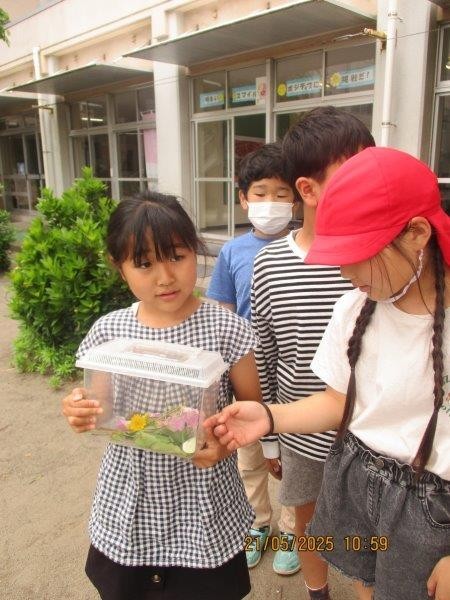 3年生は、理科の時間にキャベツ畑でみつけたモンシロチョウのたまごや幼虫の観察をしました。