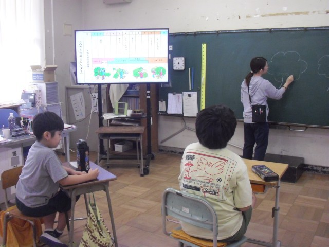 2組は、社会の学習です。みかんカレンダーを見ながら、みかんができるまでにどんな仕事があるのかを調べました。みかんができるまでにたくさんの仕事があることを知り、驚いていました。