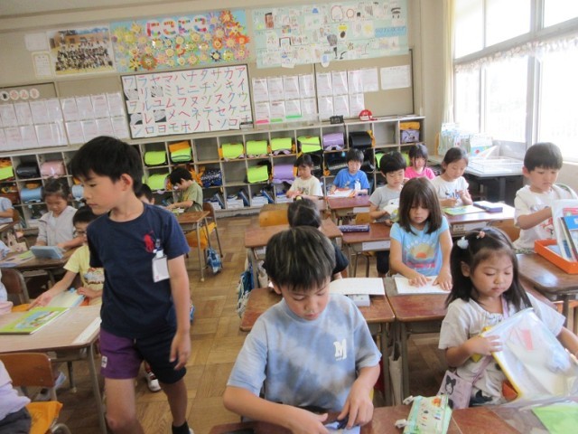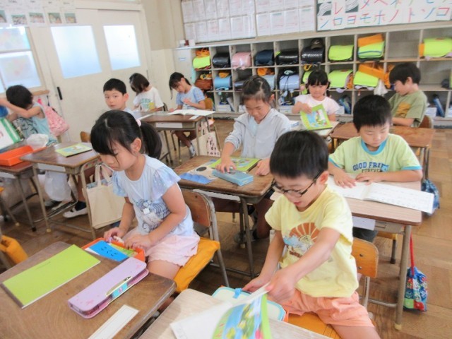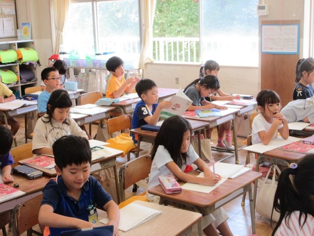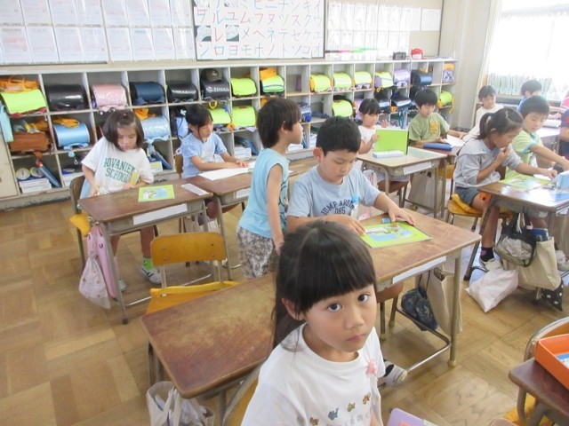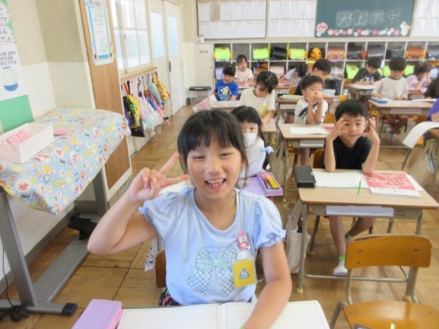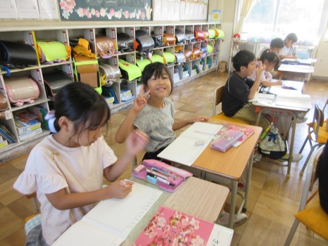 1年1,2組は、算数「10より大きいかず」の学習です。大きいの「大」の字は漢字で学習したので、漢字で書いています。だんだんひらがなだけでなく、学習した字を使ってきています。「1万も知ってるよ~!」という元気な声も聞こえています。1年生、みんな、元気です。