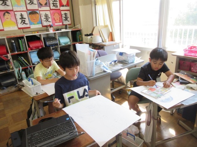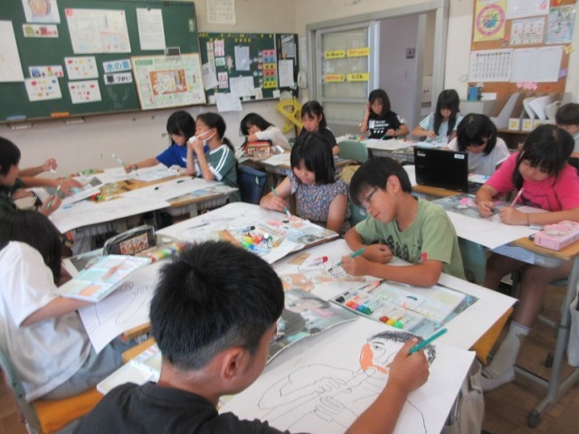 4年1組は、図工「リコーダーを吹くぼく・わたし」の学習です。肌の色を水の量を考え、絵の具で混色しながら表現しています。いろんな色を重ねています。