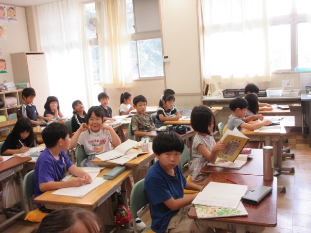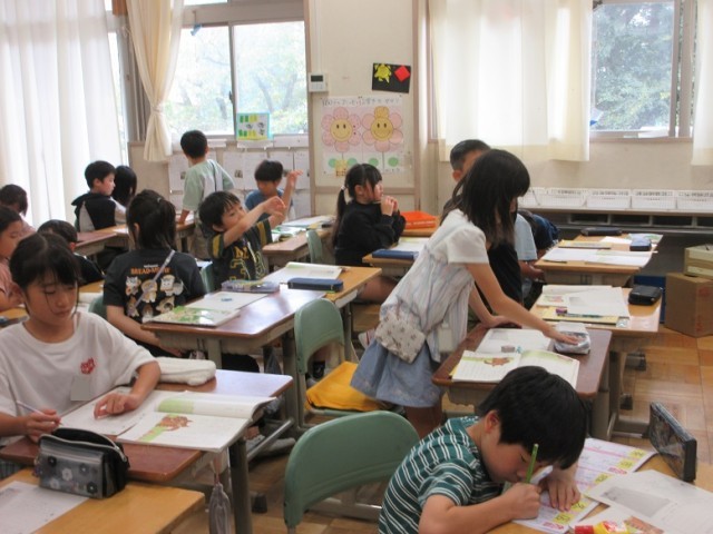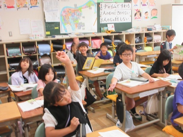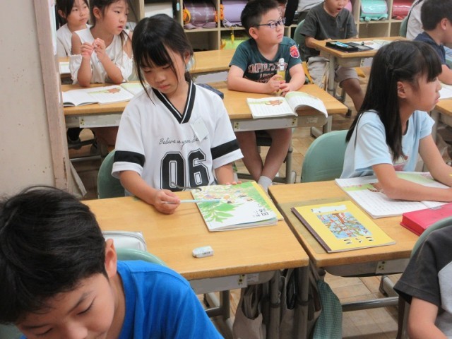 2年1、2組とも国語「ニャーゴ」の授業です。1組では、「猫の気持ちがどんな風に変化していったのか?」という課題についてみんなで考えています。また、2組では「ねこが、うむむと大きなためいきをついたのはなぜだろう」という課題についてプリントに自分の考えを書き込んでいます。
