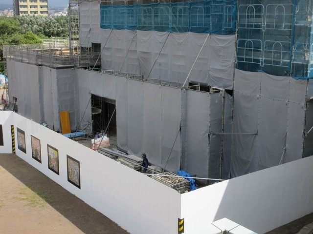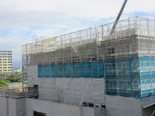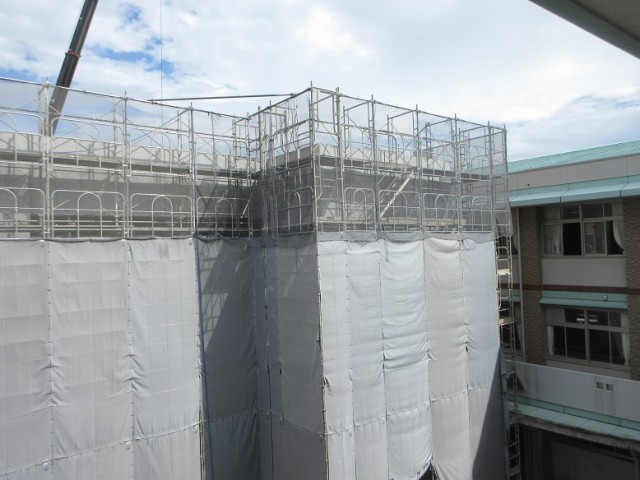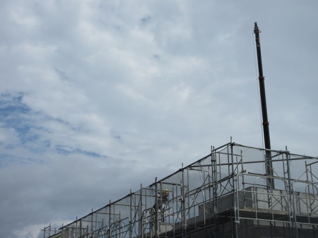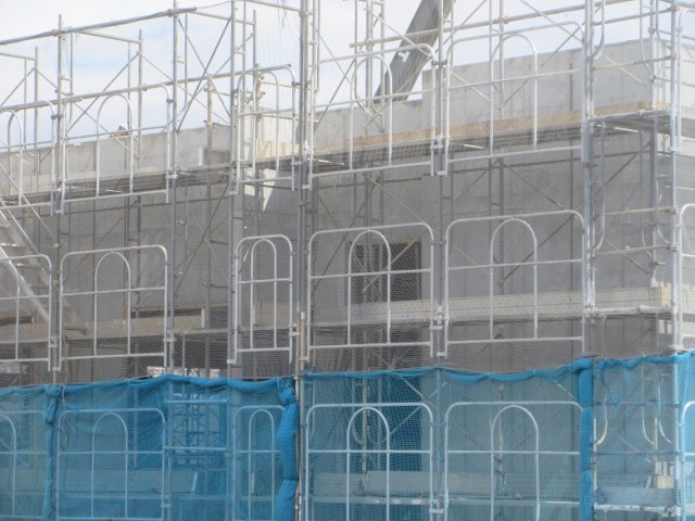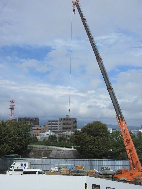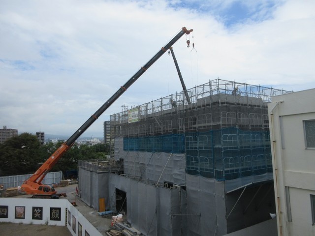 今日は大型のクレーンが2台入り、型枠を外し、下に運んでいます。ネット越しですが、コンクリートの壁面がしっかり見えるようになってきました。