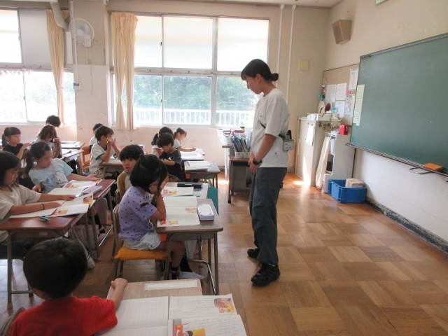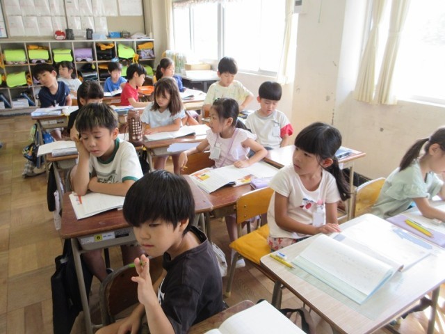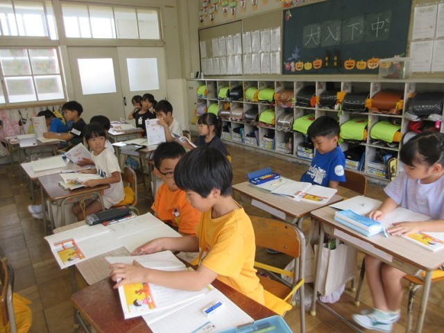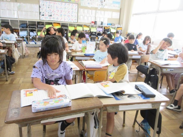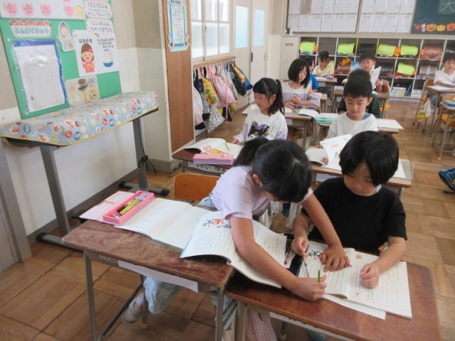 1年生は、1.2組とも国語「サラダでげんき」の学習です。どちらのクラスもまずは教科書の文を大きな声で読む練習です。読むときには、教科書をしっかり持つことや「声のものさし」を意識して大きな声で読むことなどを学んでいます。