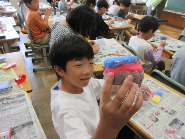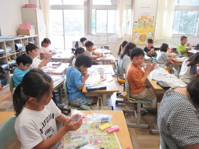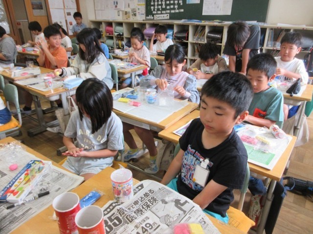 3年1組は、図工「空き容器の変身」です。カラー粘土を混ぜながら、いろんな色づくりをしています。それを容器に立体的にくっつけています。作りながらイメージが広がっている様子でした。