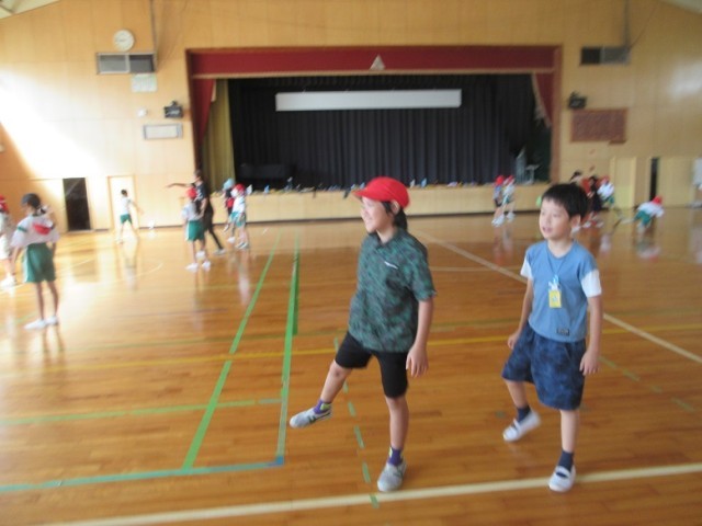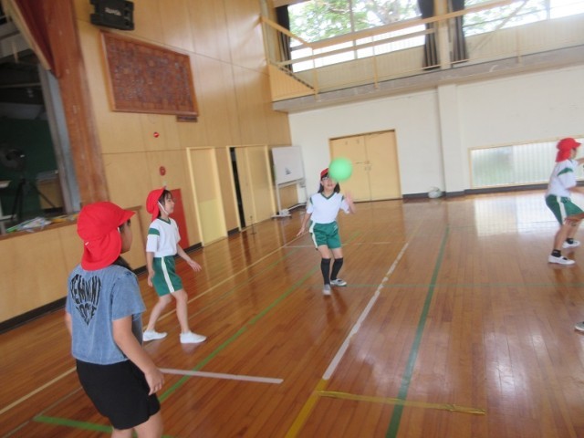 4年1組は、体育館で体育「ボール運動」です。はじめに、いろんな投げ方とキャッチの練習を楽しく行っています。