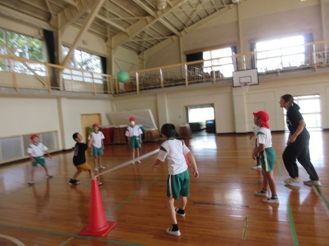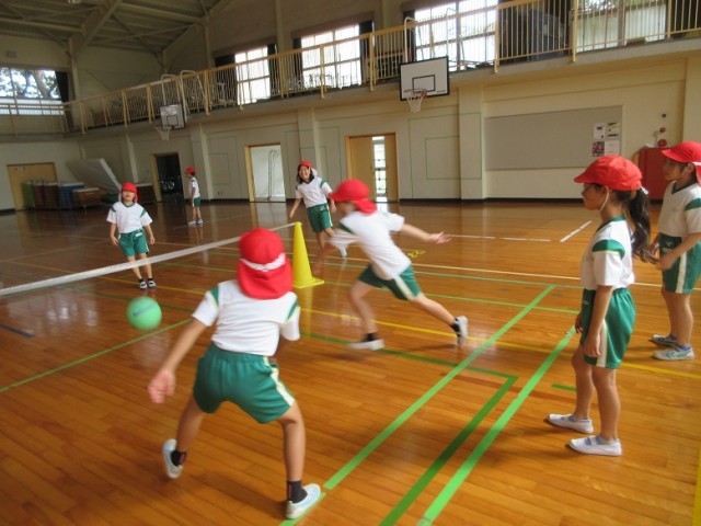 4年1組は、体育館で「プレルボール」の学習です。バウンドさせて、相手のコートに打ち返すことがなかなか難しいようでした。仲間へのパスが通ると嬉しそうでした。