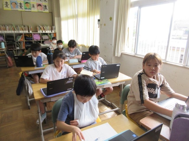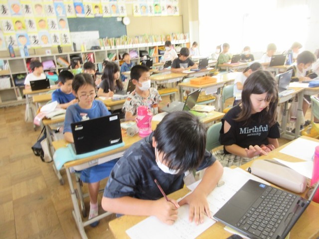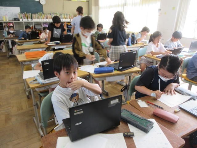 2組は、国語「ことわざ・故事成語」の学習です。Chromebookや国語辞典を使って、意味使い方を調べています。プリントを何枚も挑戦することいます。