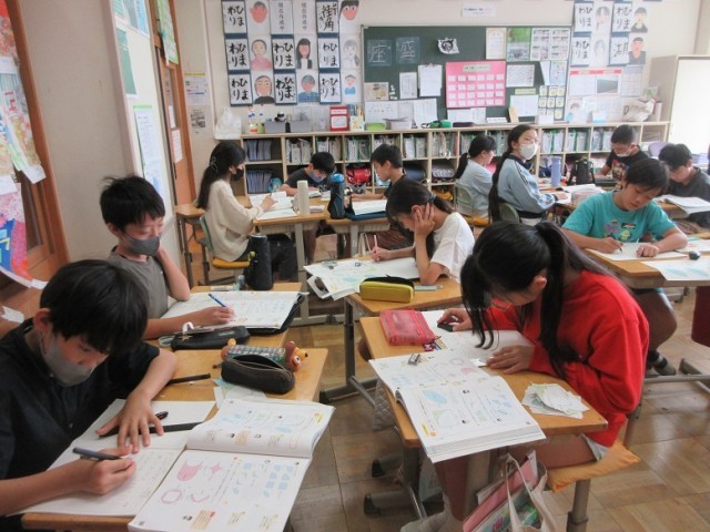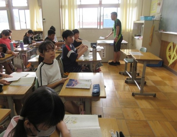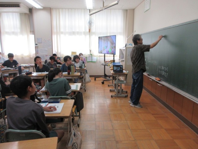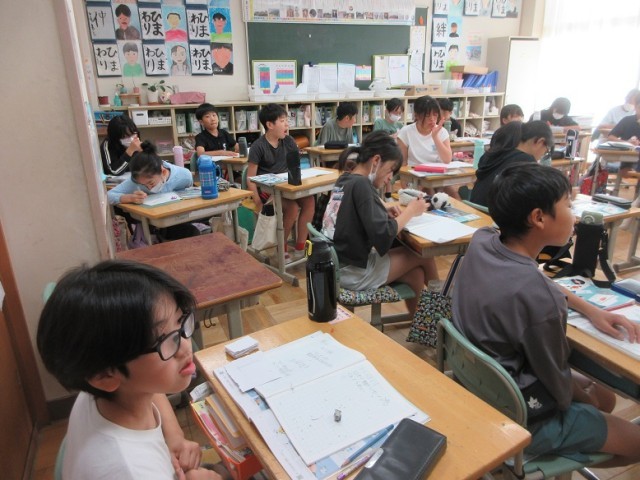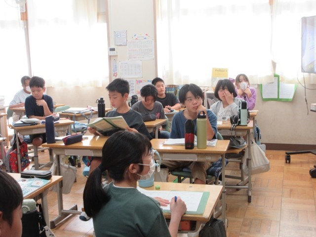 6年1組は、理科「水溶液」の学習です。次回、いくつかの水溶液が用意されます。その中には危険な物もあれば、安全な物もあるようです。どうやって見分けるのかを考えています。「飲む」は禁止ですよと先生。