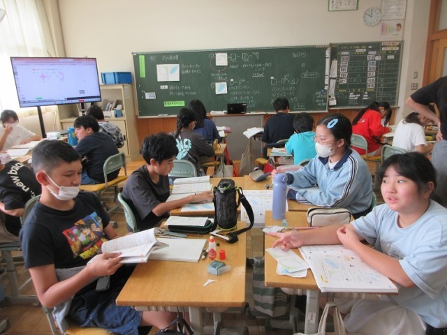 3組は、算数「円の面積」の応用です。円と正方形の組み合わさった図形の面積を求めています。「難しい」という声を上がっていますが、最後まで粘り強く取り組みました。