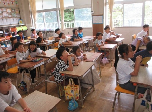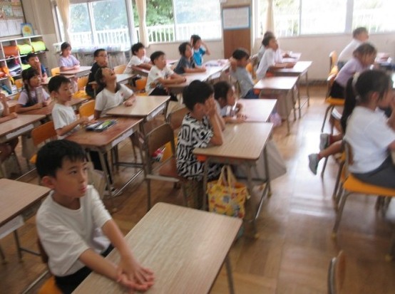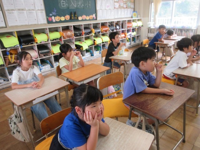 1年1組は、国語「1ねんせいの本だな」の学習が始まる前に、ブレーメンの音楽隊のお話を聞いています。みんな、しっかりと耳を傾けています。