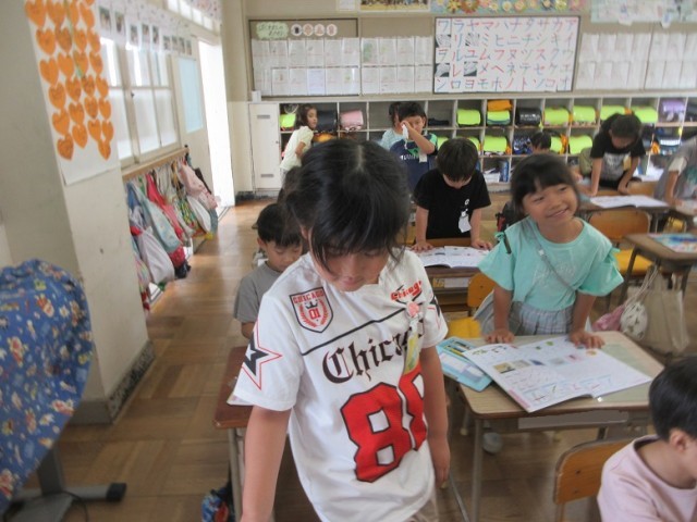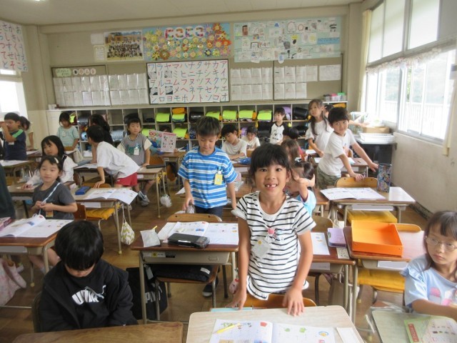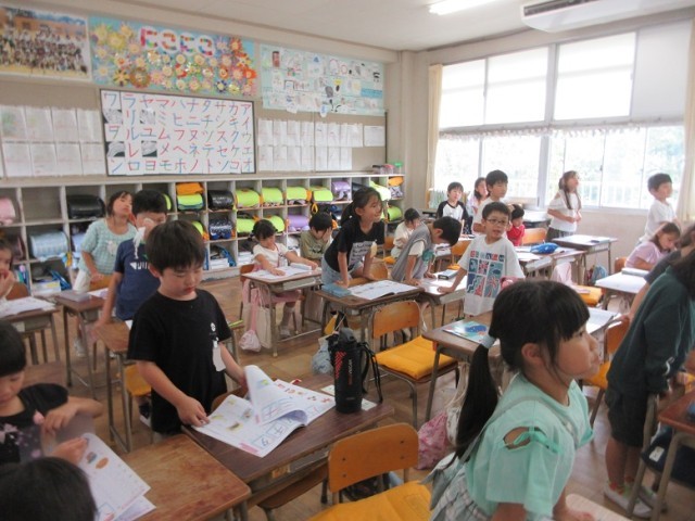2組は、国語のカタカナの学習です。今日は、サシスセソの学習です。「ソのつく言葉は?」と先生。思いついた子は立って発表するのを待っています。