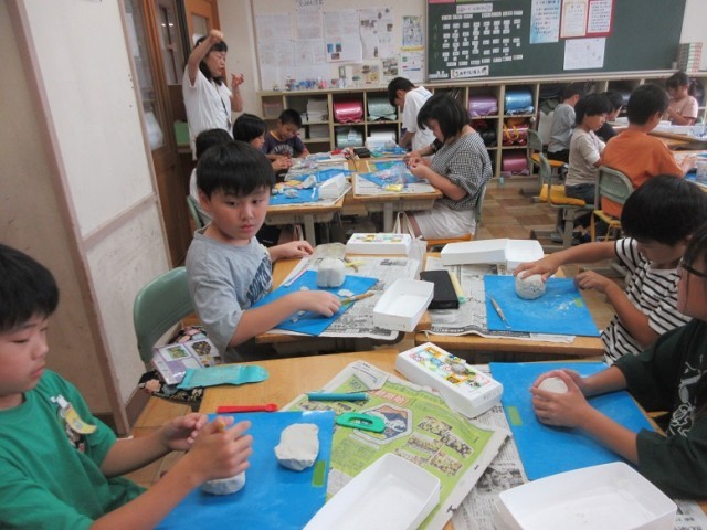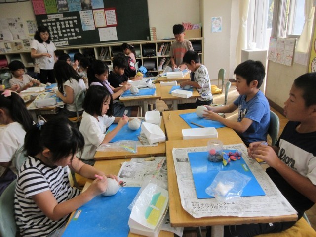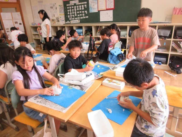 3年1組は、図工「切って かき出して くっつけて」の学習です。粘土の感触を楽しみながら、へらでかき出したり、くっつけたりしながら活動を楽しんでいます。