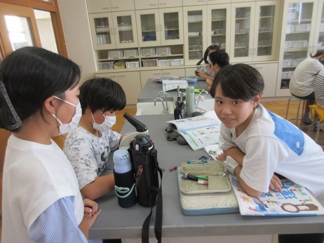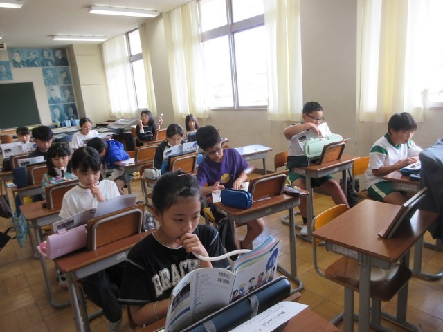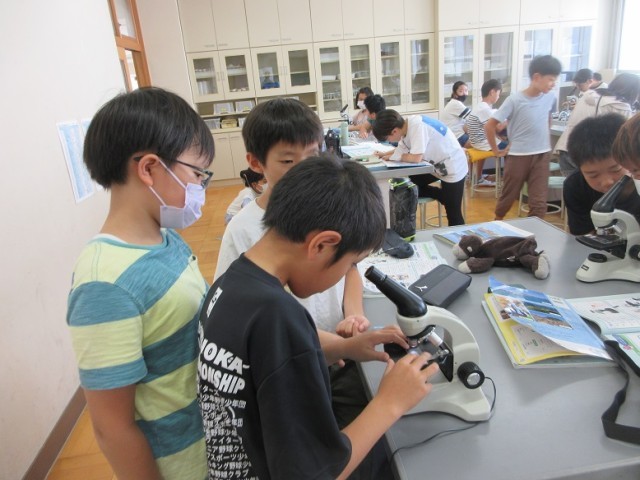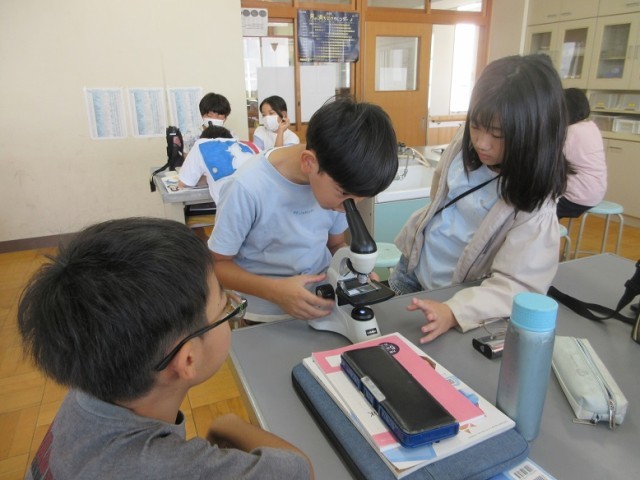5年1組は、理科「顕微鏡の使い方」の学習です。花粉のプレパラートをセットして顕微鏡をのぞきこんでいます。花粉症の子もいるみたいですが、花粉の姿が見えたかな?