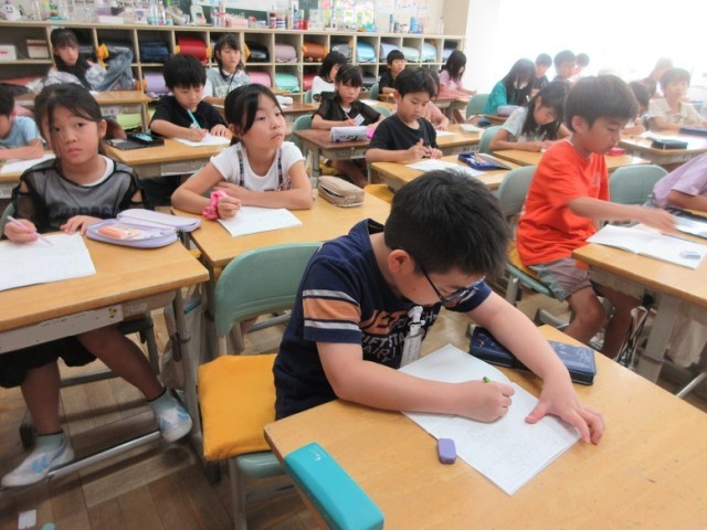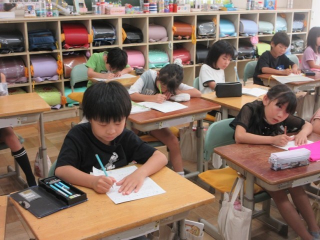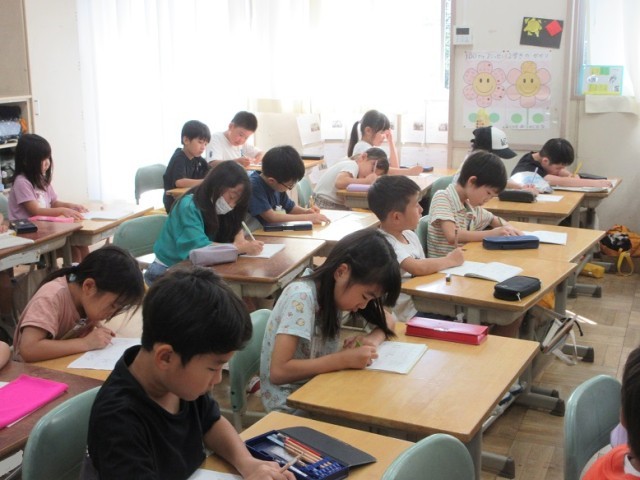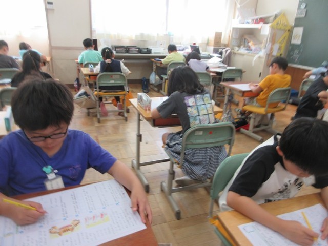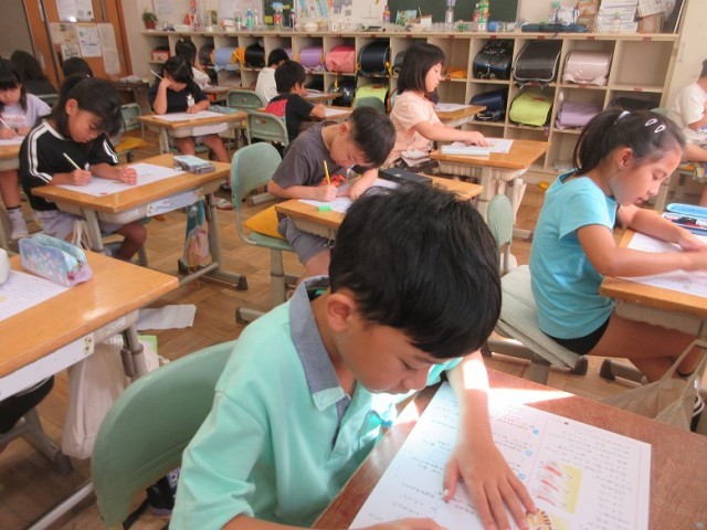 2年1組は、国語「ニャーゴ」のテストです。みんな、集中して取り組んでいます。
