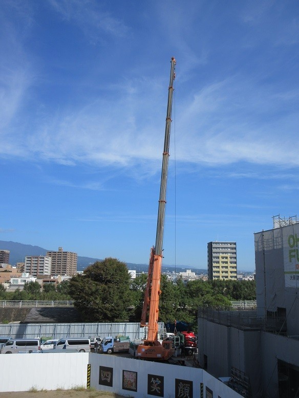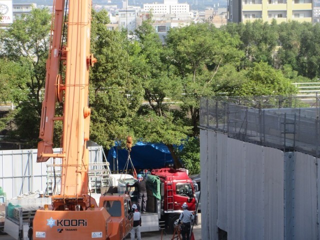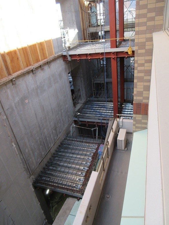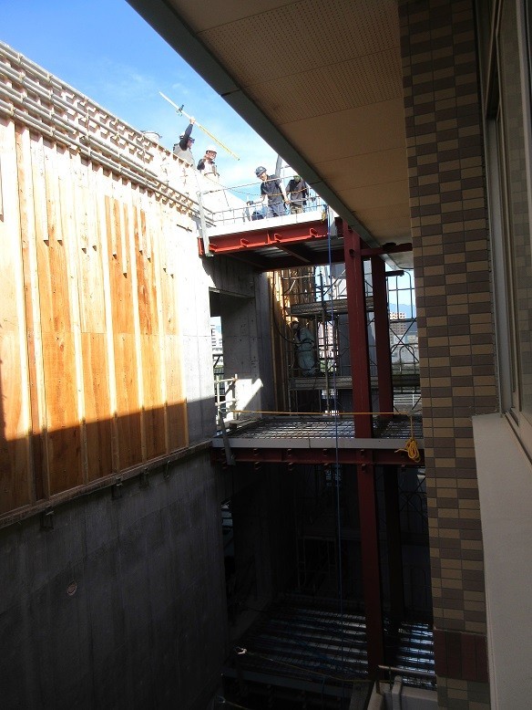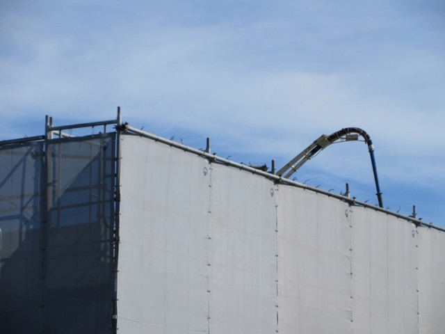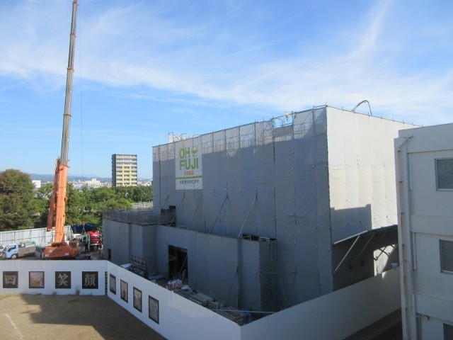 今日は大型クレーンから資材が校舎内に運ばれていました。また、新校舎と東校舎をつなぐ連絡通路ができています。ここにポンプ車からコンクリートが流し込まれていました。