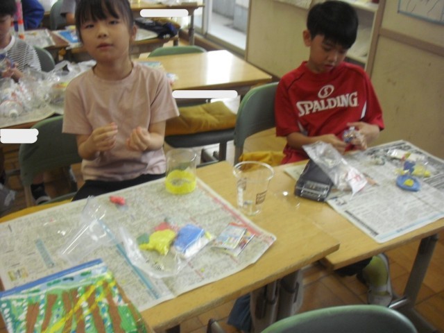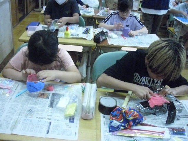 紙粘土やビーズなどの材料を組み合わせてペットボトルが変身していきます。