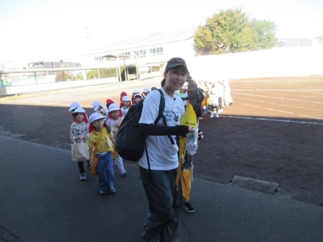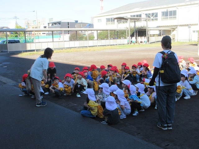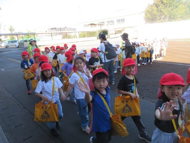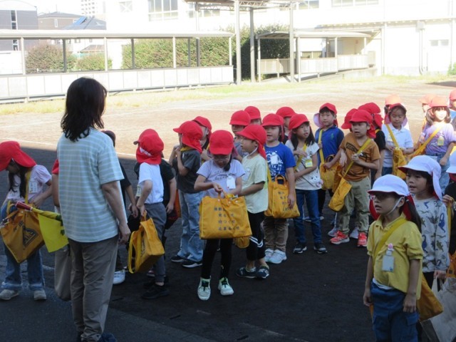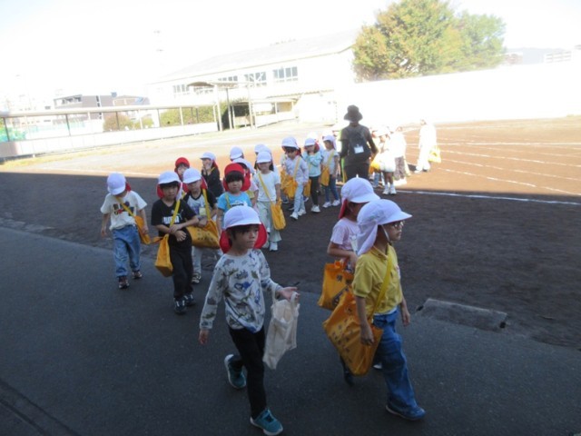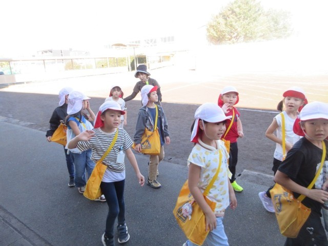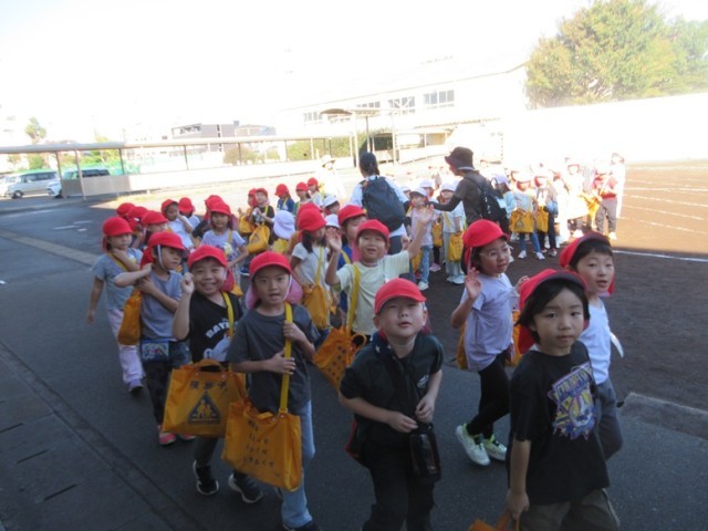 1年生は、「秋みつけ」に出かけます。先生が「ほら、お空を見上げてごらん」というと「わ~!青空だ~!」と昨日までの天気から好天になったことをとても喜んでいました。「たくさん秋を見つけて、安全に行ってこようね」と先生。みんなで、公園に秋みつけに元気よく出発です。