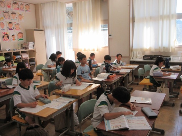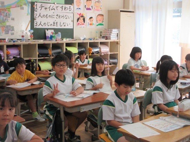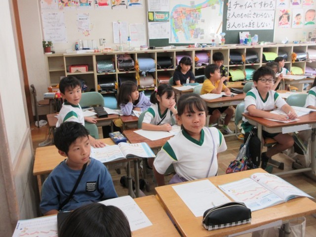 2年1組は、音楽「かねがなる」の学習です。鐘の音には、どんなものがあるのかを考えています。「カンカンカン」「キンコンカン」などたくさん考えた子もいました。