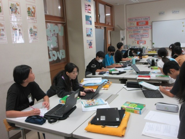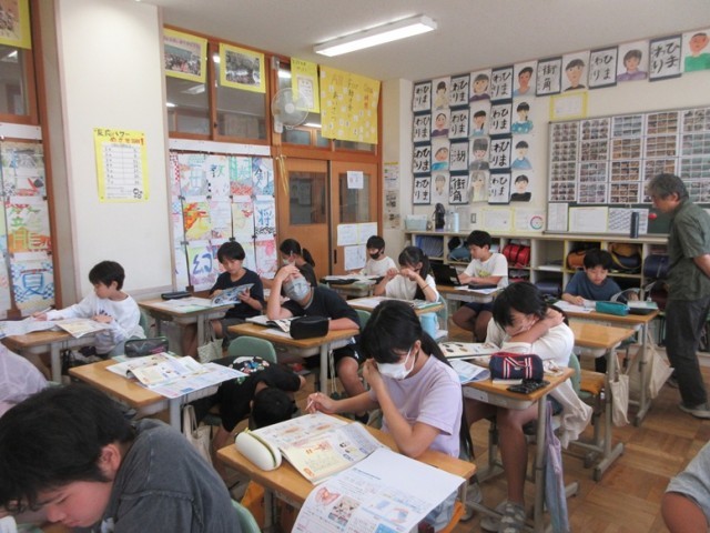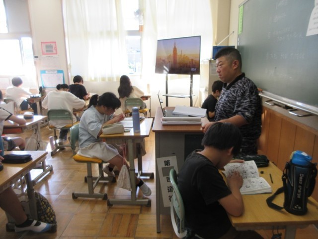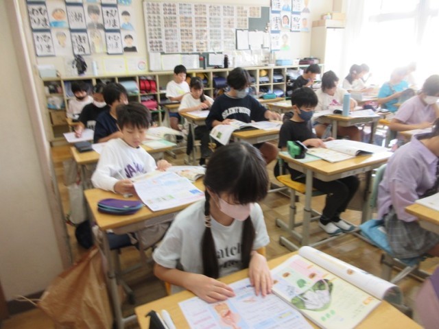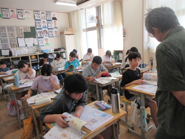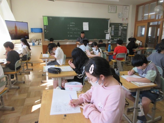 6年1組は、英語の学習です。動物について、どんな動物か、すんでいる場所などを英語で表記する学習です。6の1には、新しい友達が転入してきました。不安も多いと思いますので、みんなと早く打ち解け合えるようお願いします。