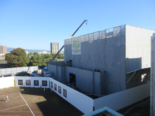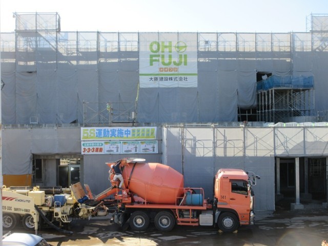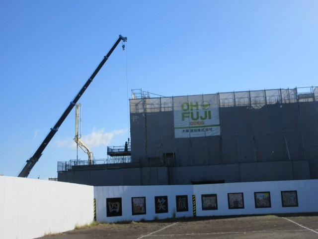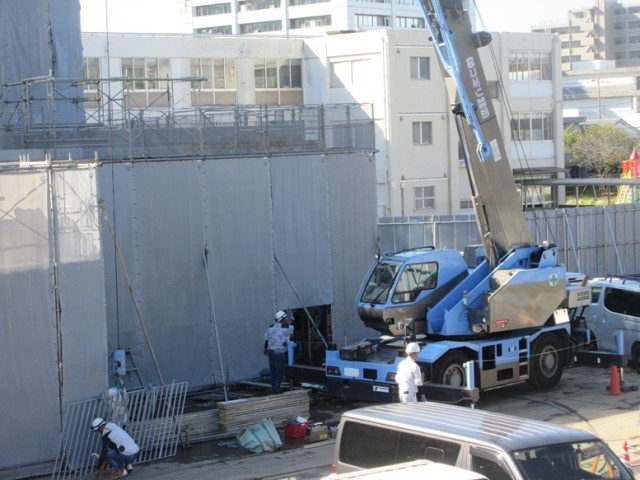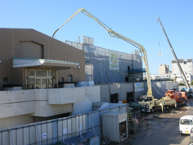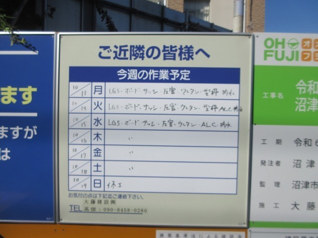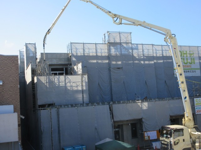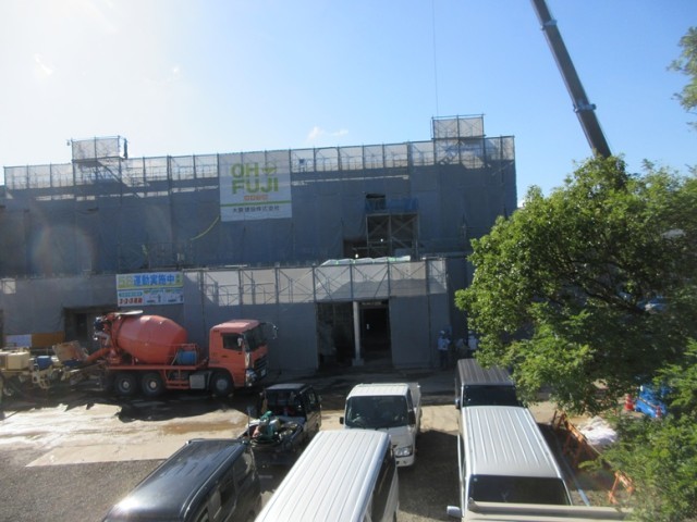 今日は大きなクレーン車とポンプ車、ミキサー車がフル稼働しています。狩野川(北)側から見るとこんな感じです。しばらくの工程は、LGS、ボード、サッシ、ALC、左官、ウレタン、防水等です。