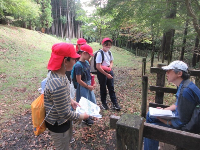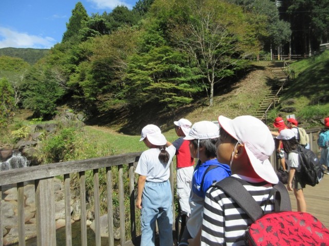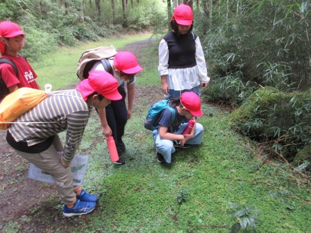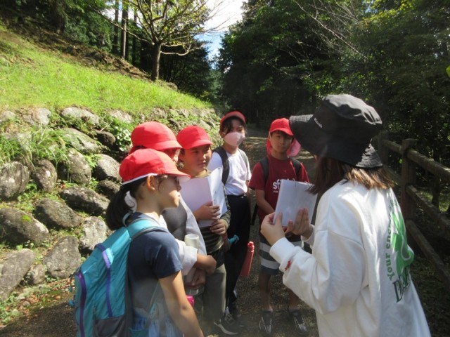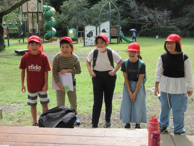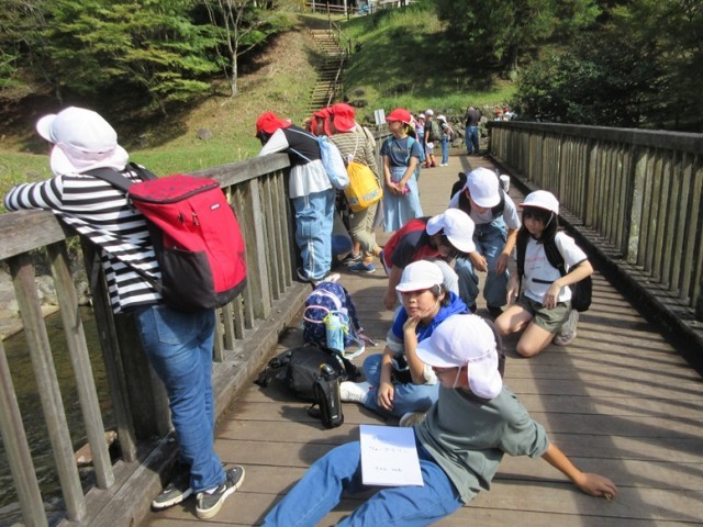 ウォークラリーのミッションである「3分間クイズ」は、1班3分かかるので、順番が来るまでかわせみ橋で一休み。この頃には青空になり、いい気分です。次のミッションは「じゃんけん葉」です。ルールはこうです。「先生と葉っぱでじゃんけんをします。先生はじゃんけんでグーか、チョキしか出しません。どちらを出すかは班で決めてかまいません。必要な葉っぱの形を探してください」というものです。みんなでじゃんけんの形の葉っぱを探して勝負です。