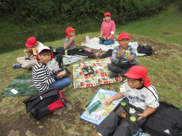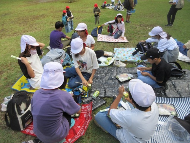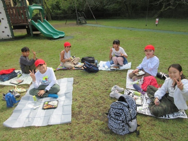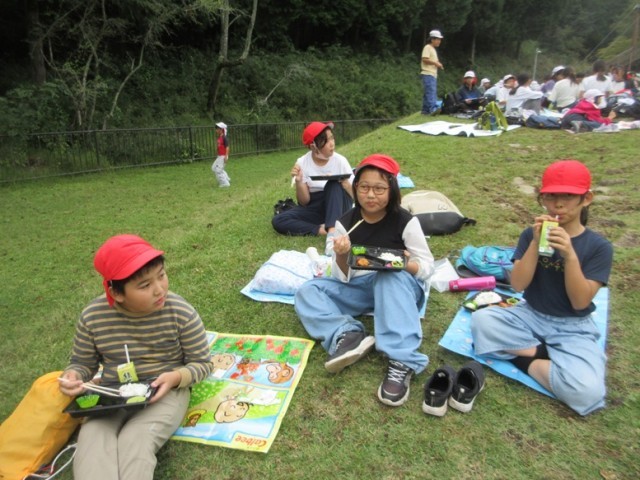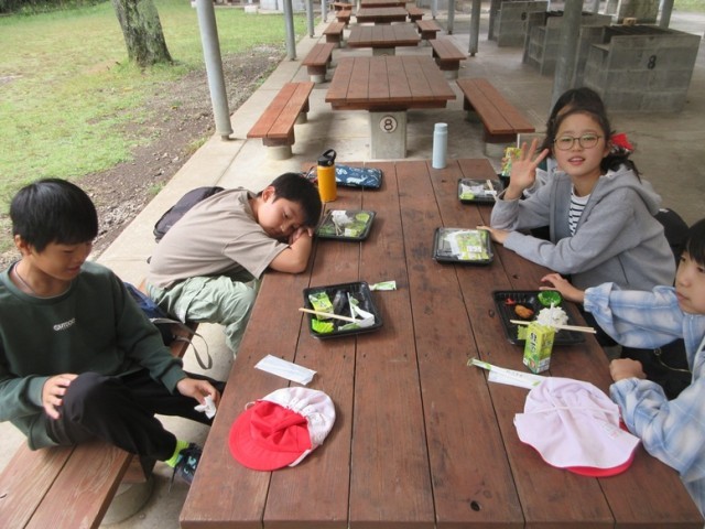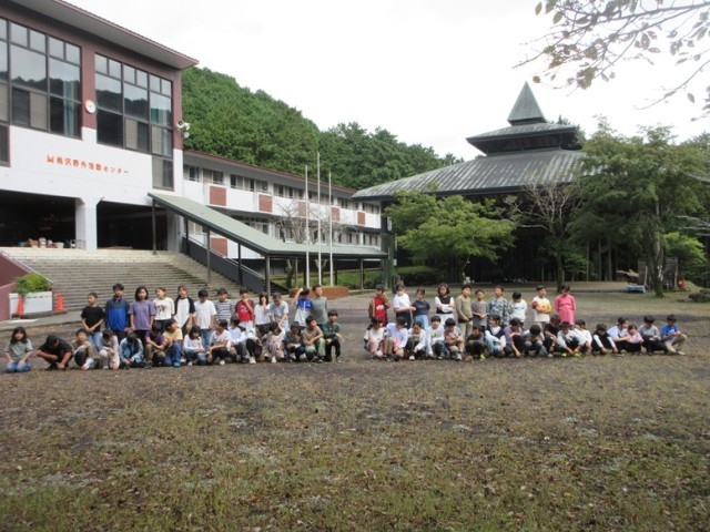 一人になってしまう子がいないようにと、グループで優しさ発揮です。お弁当を食べ終わると、疲れがどっと出てくる子もいましたが、この後は、入所式です。その前に、全員で宿泊棟の前で記念撮影。はい!ポーズ!