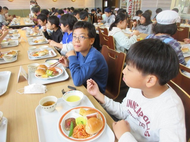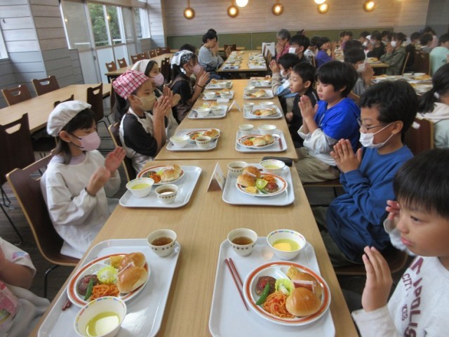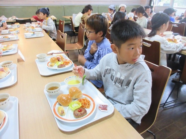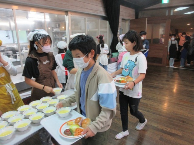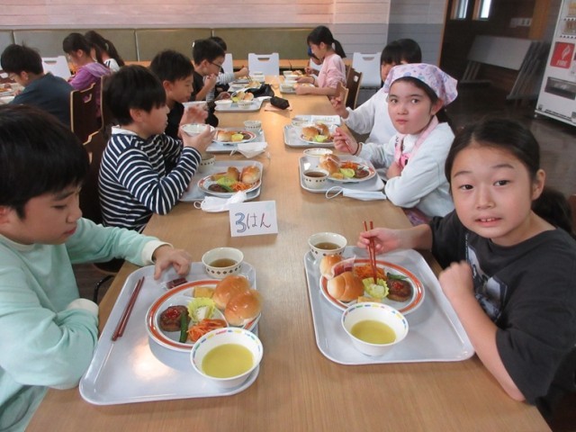 二日目、朝のラジオ体操の後、朝食です。メニューはロールパンにハンバーグです。今日のメイン行事は、カレーライスコンテストです。