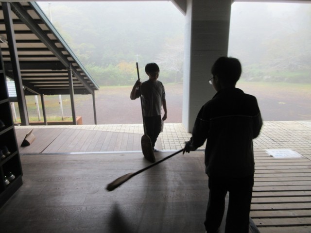 朝食後に、「来たときよりも美しく」と掃除や片付けを行い、炊事場に向かいます。少し霧はありましたが、明け方に降っていた雨もやみ、傘を差さずに炊事場に向かうことができました。