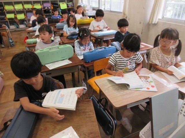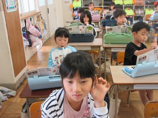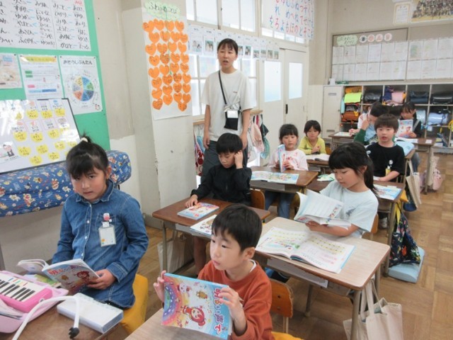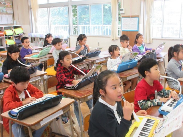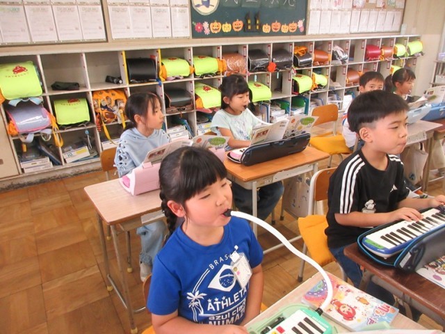 1年生は音楽の学習です。1組は、「どんぐりさんのおうち」にあわせて、「レモンさんのおうち~どこでしょう?」と先生。みんなもレモンさんのおうちを探して、楽しみながら音を出していました。