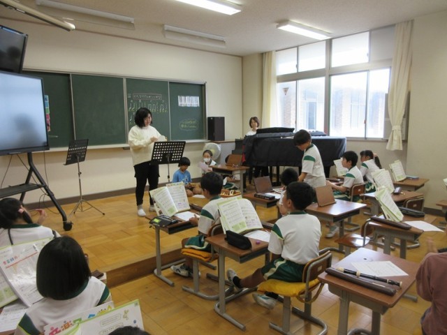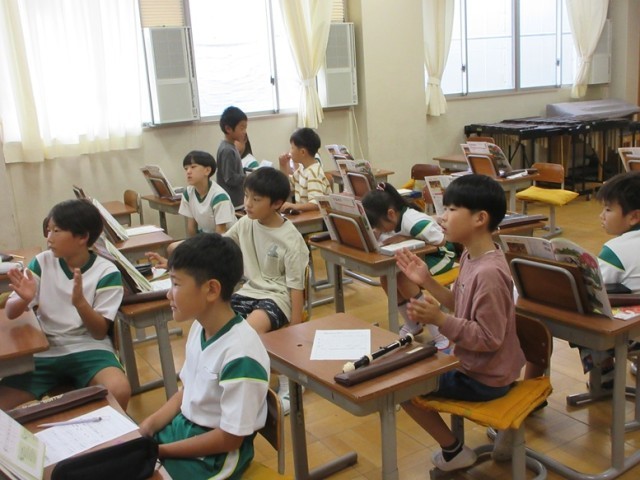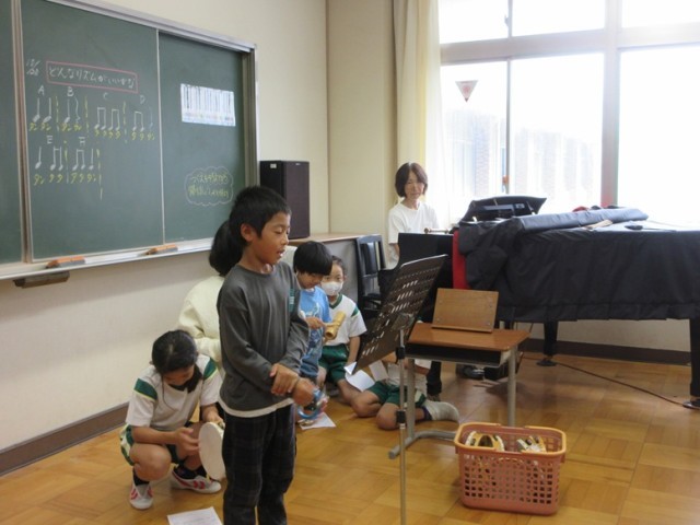 3年1組は、音楽「リズムづくり」の学習です。みんなの前で1人1人発表です。ちょっぴり緊張感のある中での演奏です。