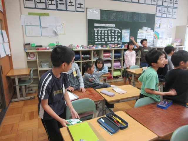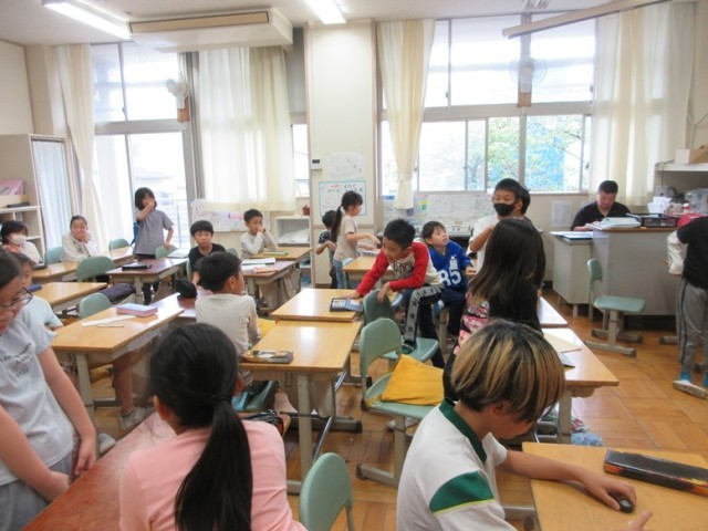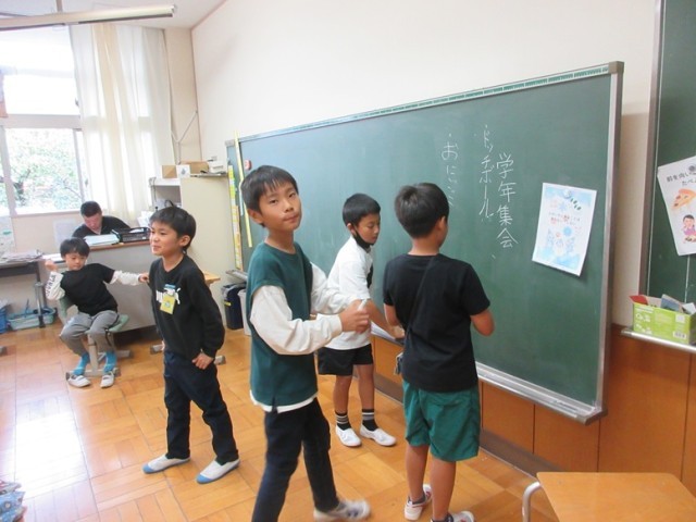 2組は、学活で学年集会について話し合っています。司会者は、ドッジボールか鬼ごっこかを決めるため立ってもらい、その数を確認していました。楽しい学年集会を企画して、成功させましょう!