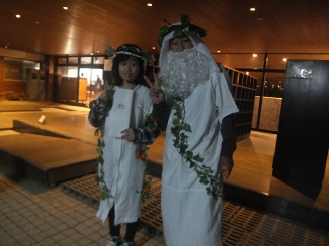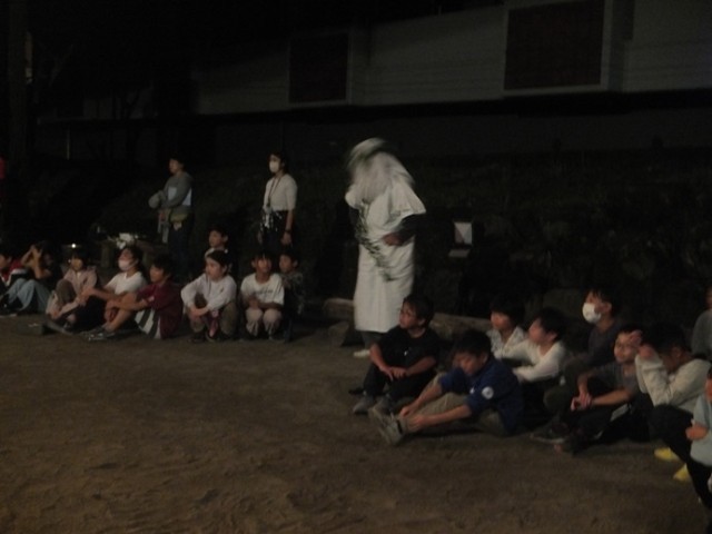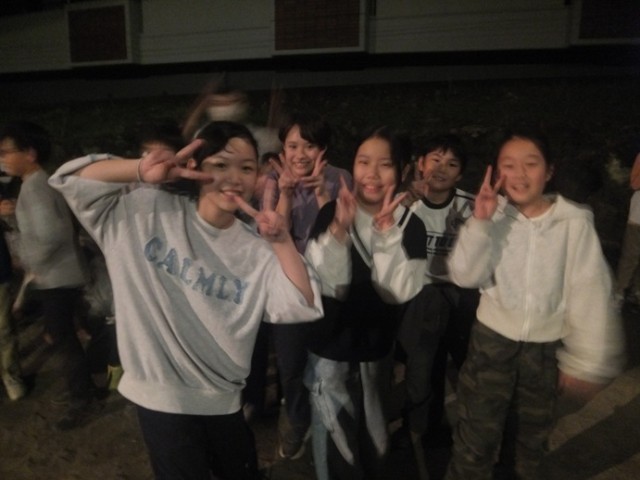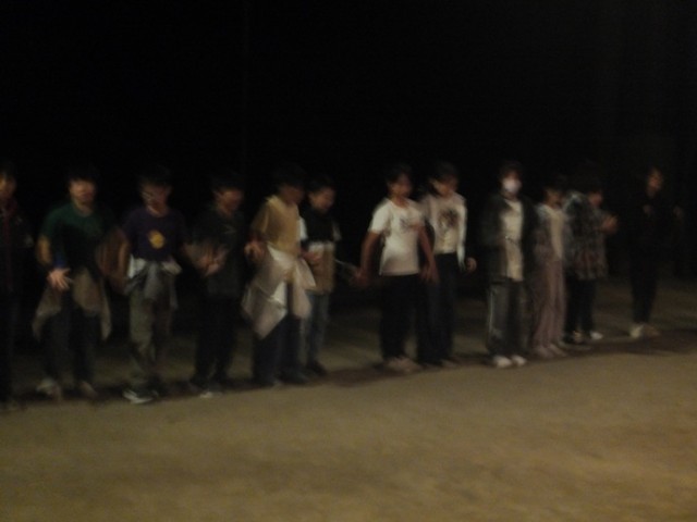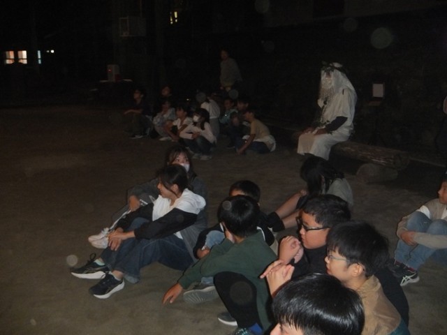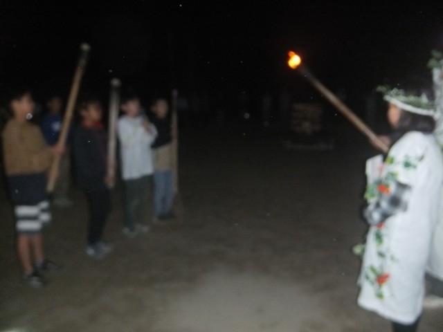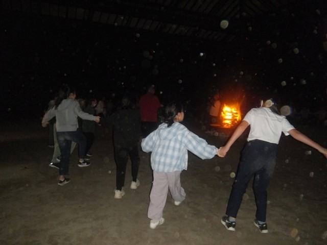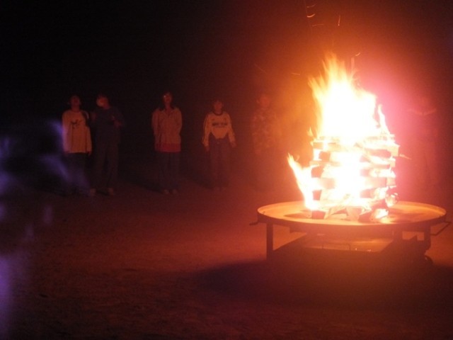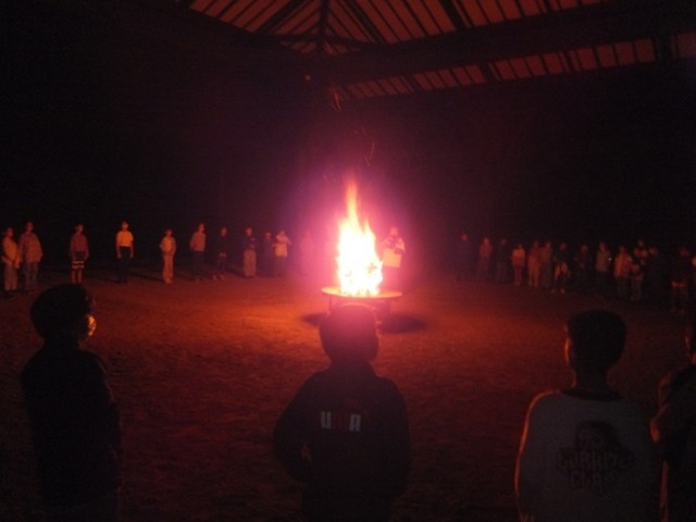前回の特集にはなかったキャンプファイヤーの写真です。火の神も激写されています。みんな、楽しそうにフォークダンスやスタンツを踊っています。