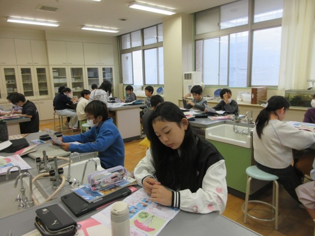 5年1組は、理科「植物の実や種子のでき方」のテスト返却でした。おしべのことなどをもう一度、確認しています。