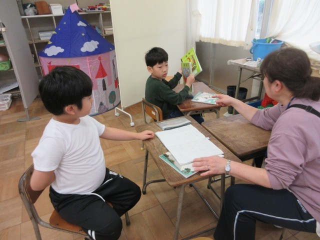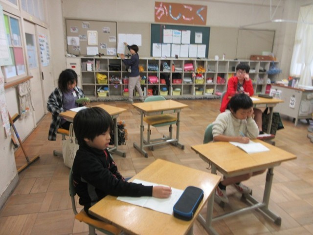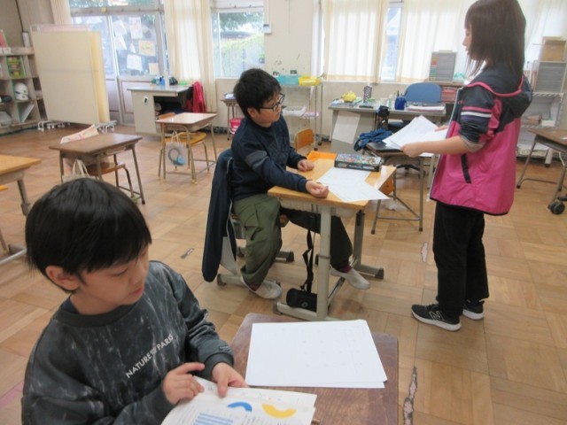 2組は、個々に応じた進度で算数のプリントに取り組んでいます。かけ算の筆算、四捨五入などに取り組んでいます。「プリントいっぱいある~!」という子もいましたが、先生に励ましてもらいながら取り組んでいました。
