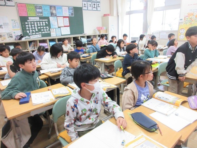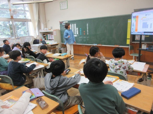 3年1組は、算数「大きい数はどうやって表したらいいのだろう?」という課題に向けて、みんなで考えています。「わかった!」と子供たち。「まだ言わないでよ」と先生。言いたくて、言いたくて仕方ない子がたくさんいました。