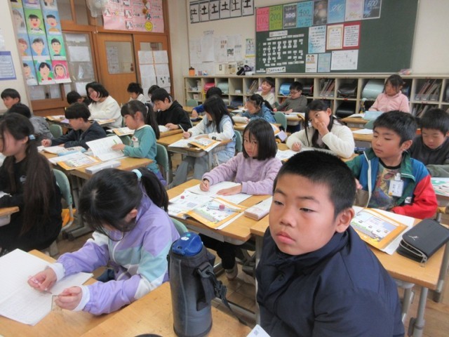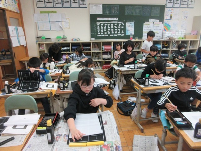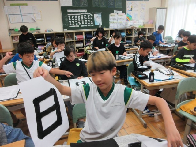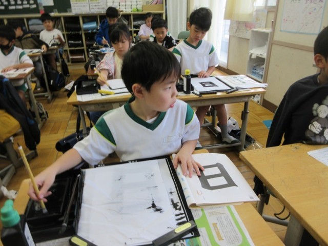 2組は、書写毛筆「日」の学習です。特に「おれ」を意識しながら練習していました。名前も集中して書いています。