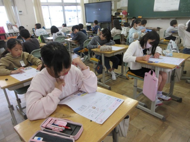 4年1組は、算数「がい数」のテストです。みんな、集中して取り組んでいます。終わった子は、狩野川に関するスライドを作っています。
