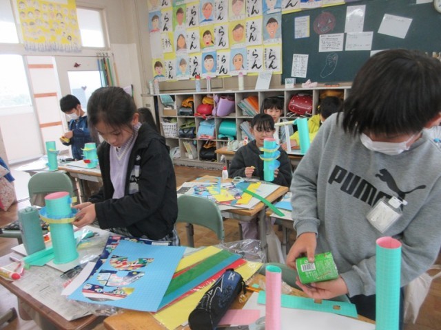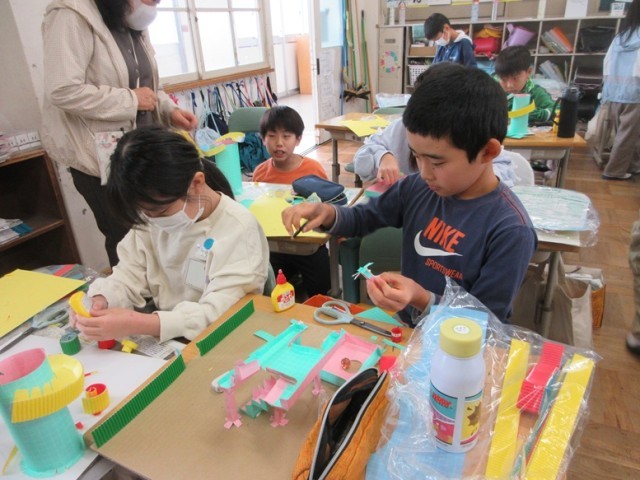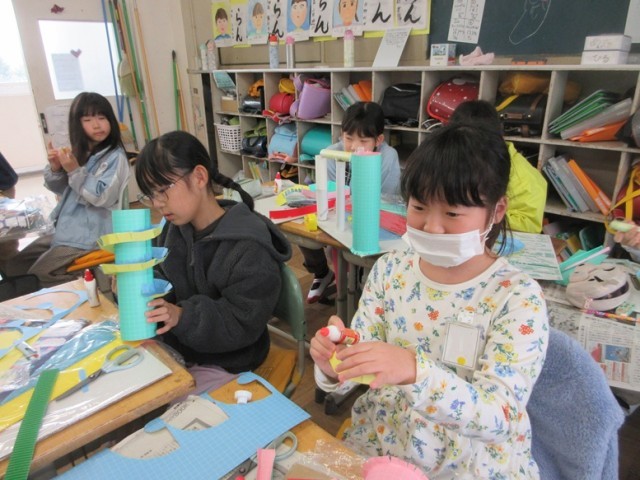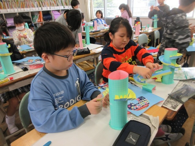 2組は、図工「コロコロガーレ」です。「見て!ここトランポリンみたいにしたんだよ」「考えずにやってたから、ここからどうしようかなって。もう少し高いところにお城をつくるつもり」といろいろ教えてくれました。アイデアがあふれる授業でした。