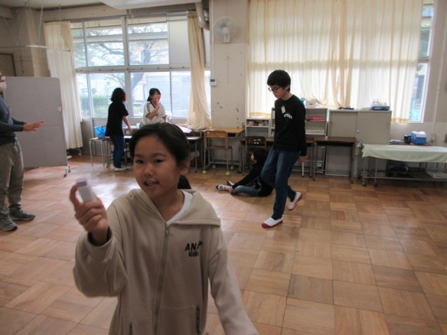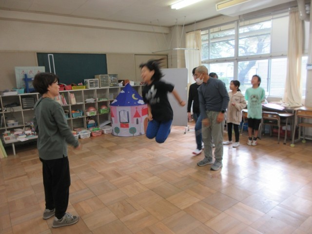 7の1組は、朝の会のあと、プレイルームで朝の運動です。長縄をして体を動かしています。元気よく、タイミングを見ながらジャンプしています。