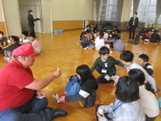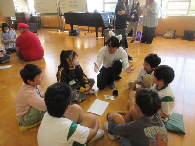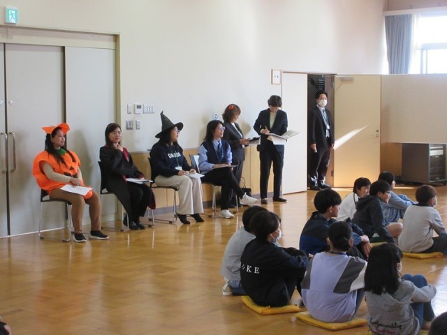 今日は、市内のALTが四小に集まって学習するEnglish Dayです。5年生が代表でその授業を受けました。ハロウィンが近いので、ALTの先生方は仮装して登場してくれました。「Let's ask!」「Let's talk!」「Let's listen!」の3つを目標に、みんな、積極的に耳を傾け、質問していました。自己紹介をするとカードに貼るシールをもらいました。みんな、楽しいひとときを過ごすことができました。