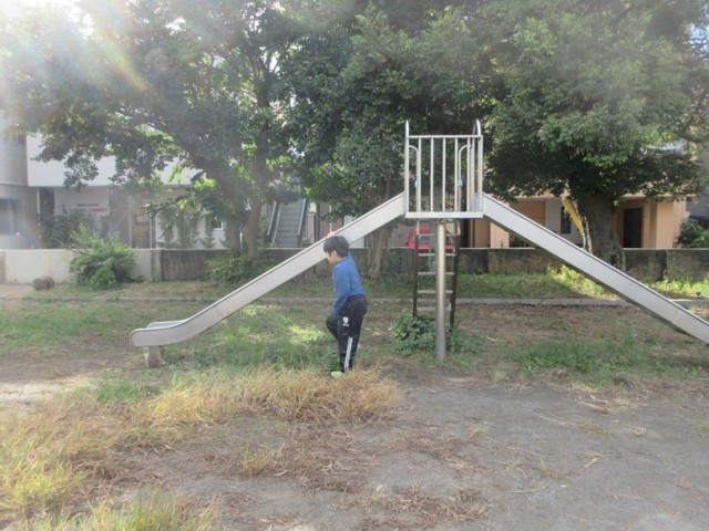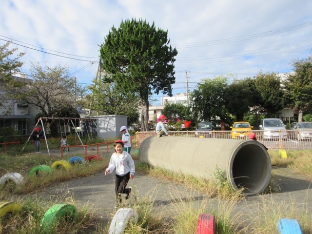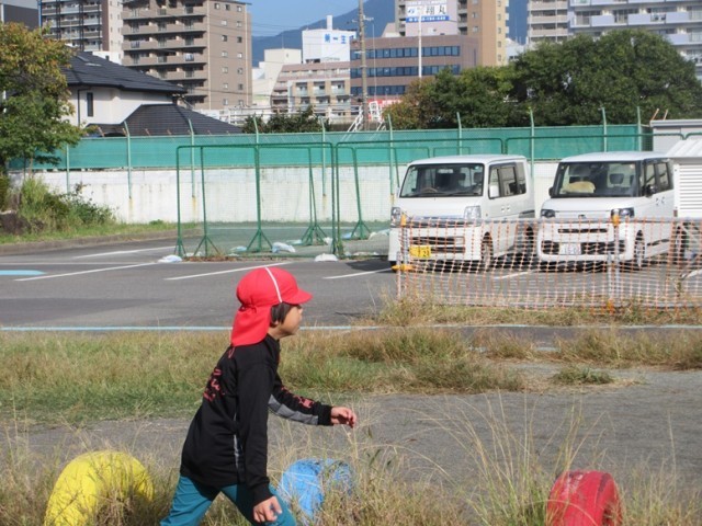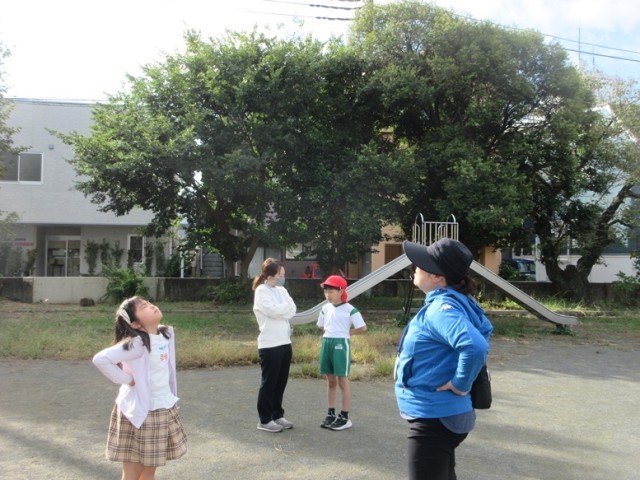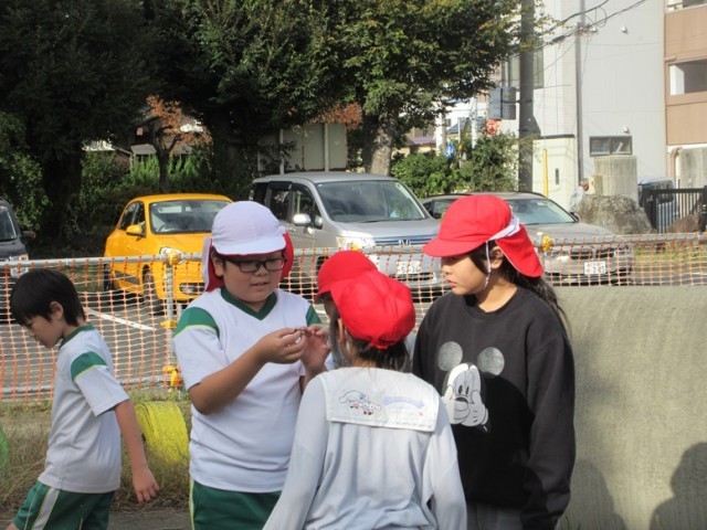 7の1,2組は、朝の運動です。少しヒヤッとする空気が気持ちよく感じます。今日は気持ちのよい青空です。おやおや、今日も何かを見つけた子がいます。なんと、大きなトノサマバッタでした!