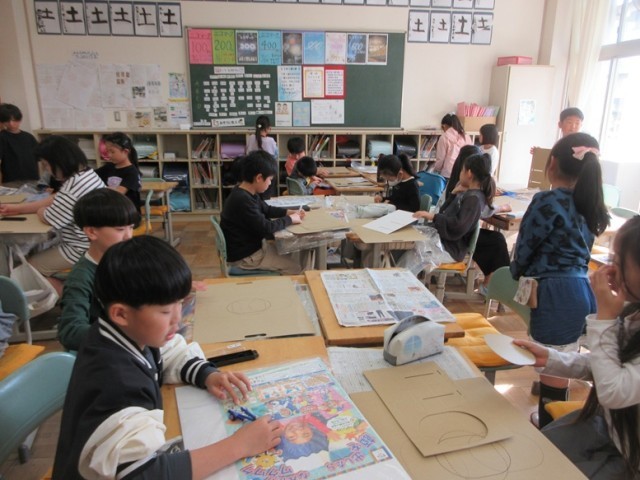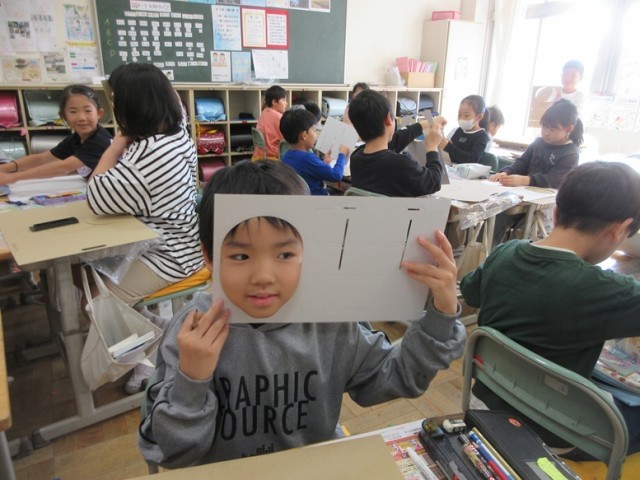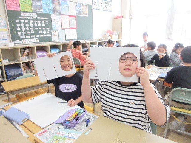 3年1組は、図工「顔を出したらなんだかワクワク」の学習です。顔出しパネルを考えていきます。さあ、どんなものに変身できるかな?ワクワクしますね!