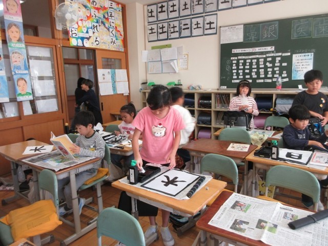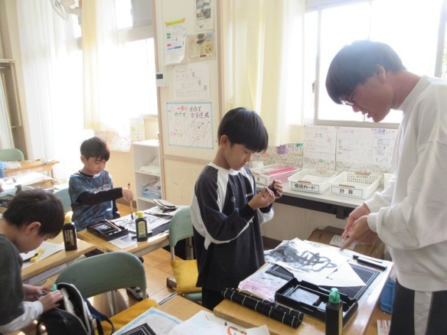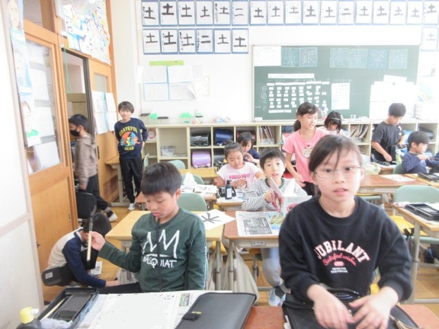 2組は、書写毛筆「木」の練習です。はらいに気をつけながら、集中して書きました。片付けの時は、手が真っ黒な子もいました。頑張った証拠かな。