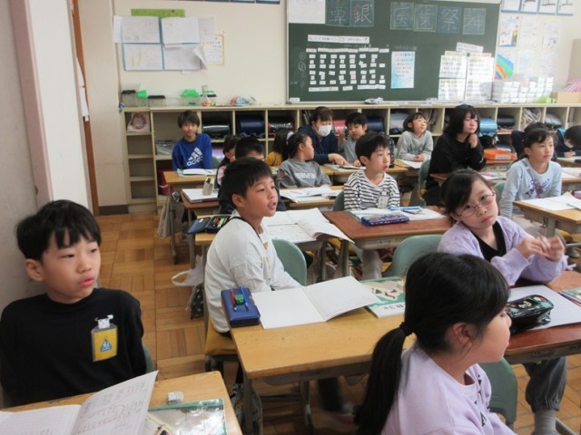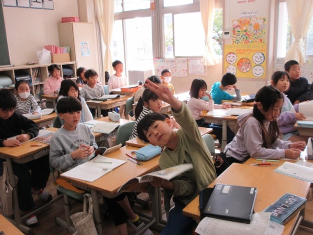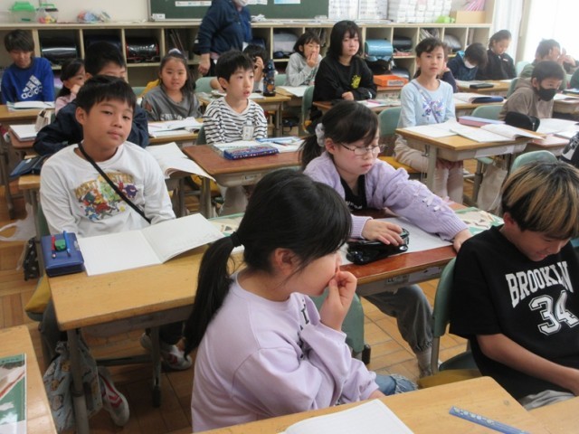 3年1組は、国語「道具のひみつをつたえよう」の学習です。何の道具について調べるかを考えています。はし、定規、スマホ、釣り竿などの意見が出ていました。さあ、何の道具について調べていくのかな?