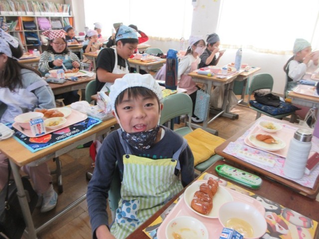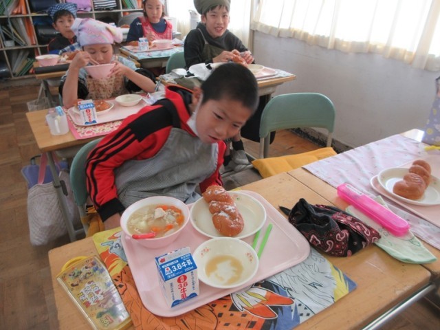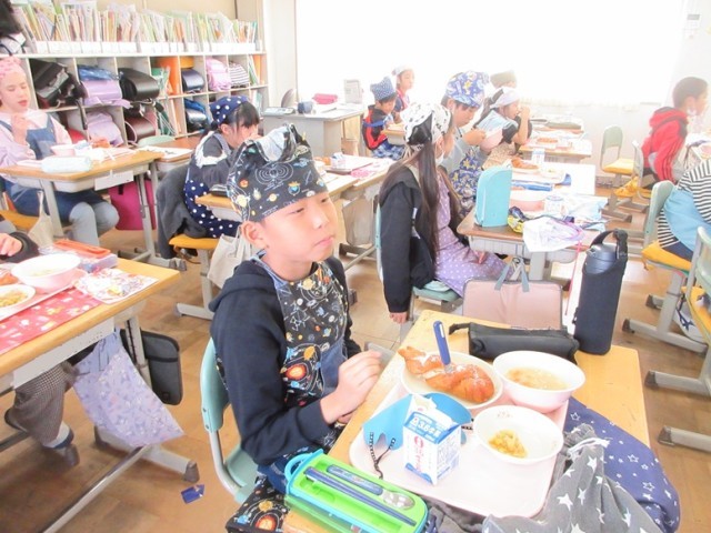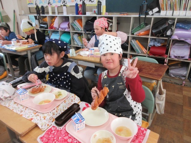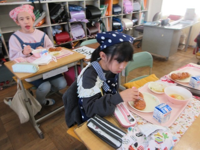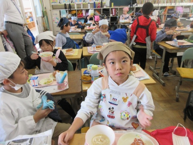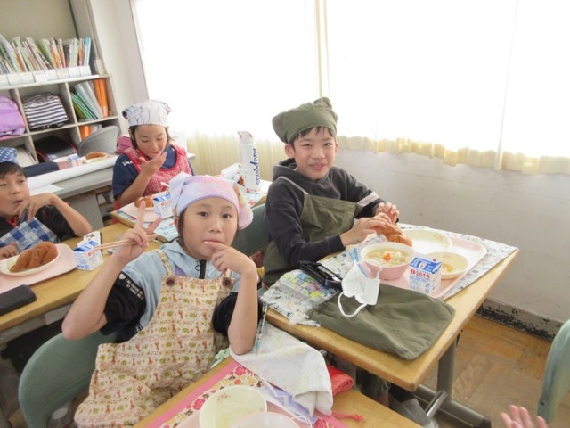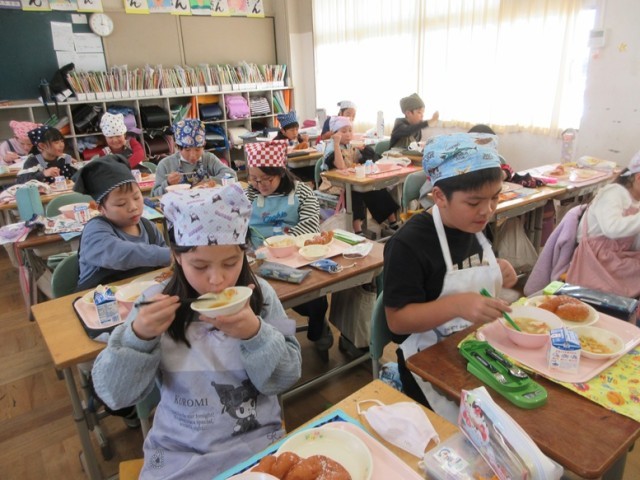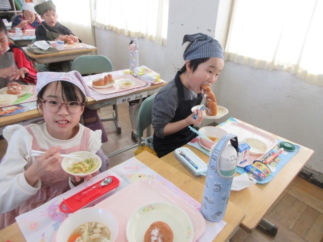 4年2組も人気メニューの揚げパンをおいしそうに食べています。話題がこんにゃくサラダにならなかったけれど、たくさんおかわりしていました。ポトフも人気でした。作ってくださる方々に感謝して、たくさん給食を食べましょう!