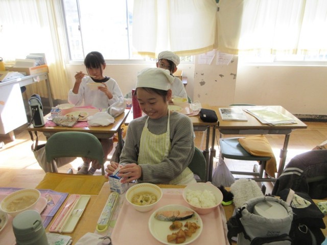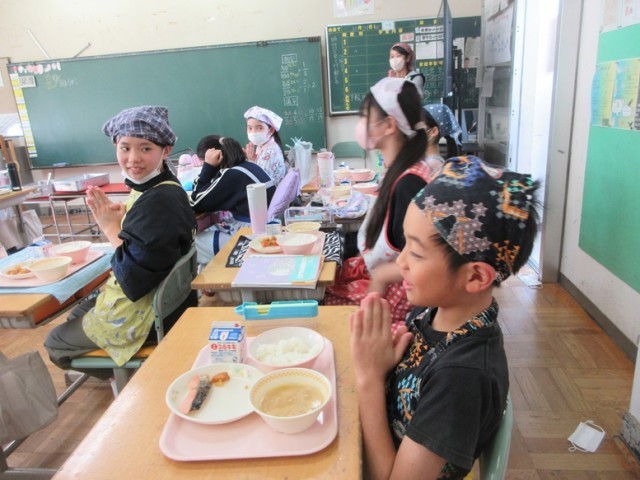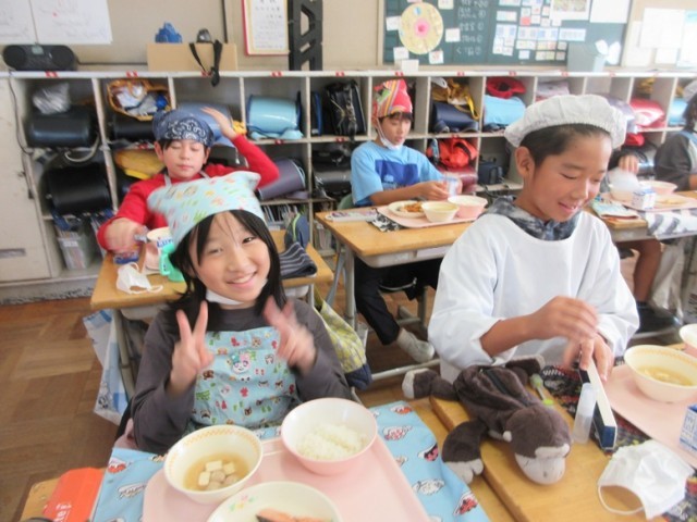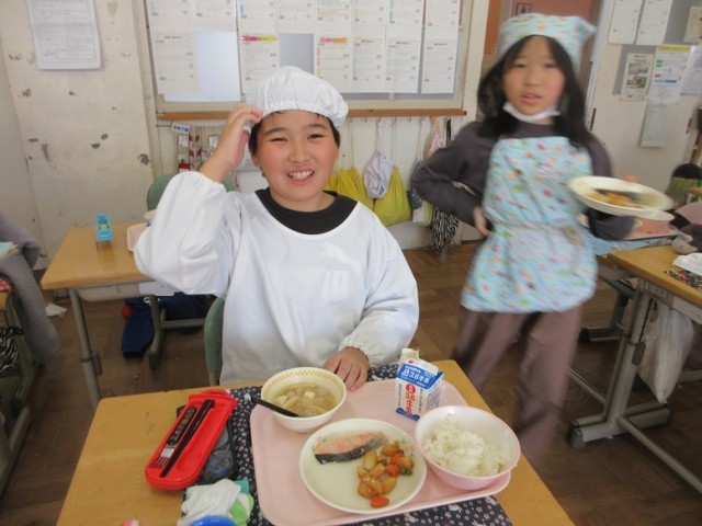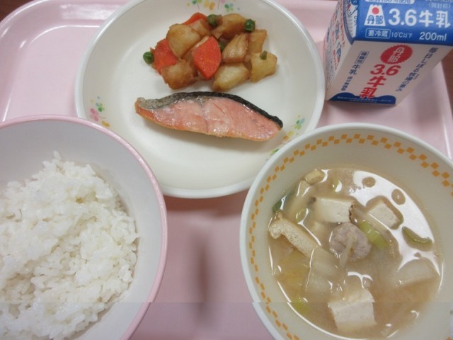 今日のメニューは、ご飯、焼き塩鮭、じゃがいもの揚げがらめ、肉団子汁、牛乳です。5年1組では、どれもおいしそうですが、「肉団子汁か~」という子が何人かいました。「だって、家庭科の調理実習で味噌汁作ったんだもん」という理由でした。なるほど。それなら味比べですね!